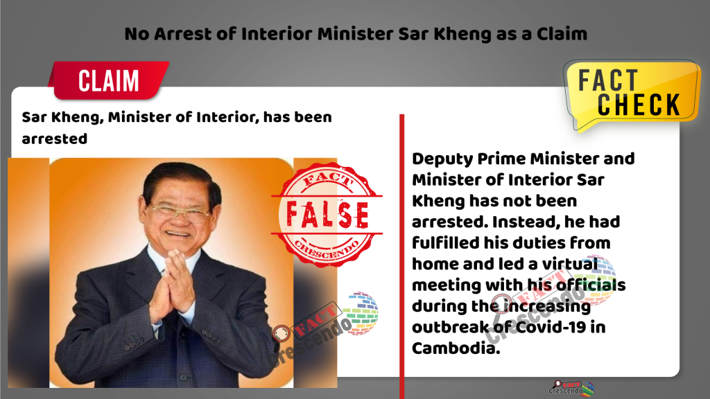 Fact Crescendo Cambodia found out the claim as mentioned above is false. Deputy Prime Minister and Minister of Interior Sar Kheng has not been arrested. Instead, he had fulfilled his duties from home and led a virtual meeting with his officials during the increasing outbreak of Covid-19 in Cambodia.