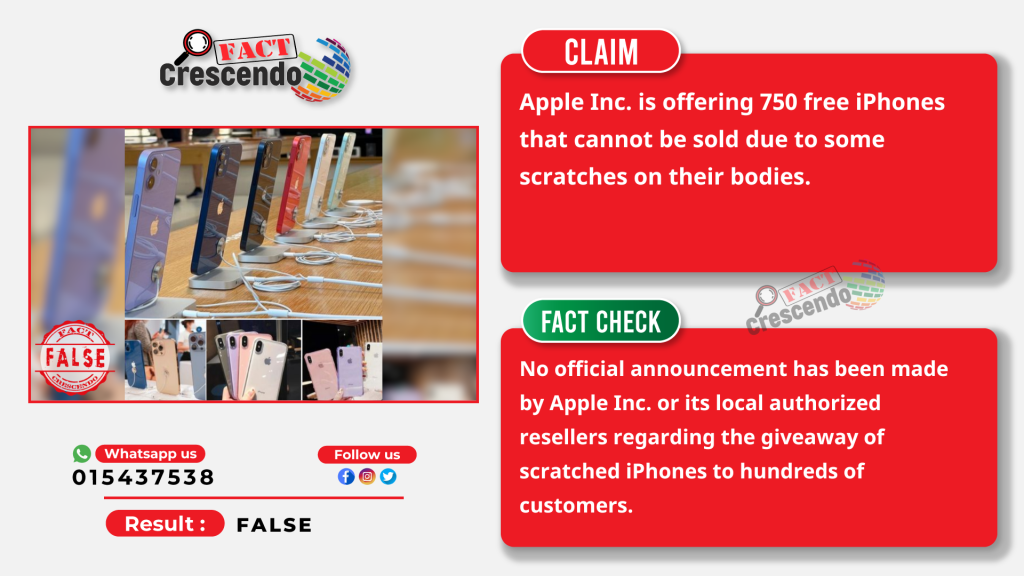 Fact Crescendo Cambodia has confirmed that rumors suggesting Apple was distributing slightly scratched iPhones are false. Companies licensed to distribute and retail iPhones in Cambodia do not release such information. Additionally, digital security experts have identified such advertising as an online scam.
