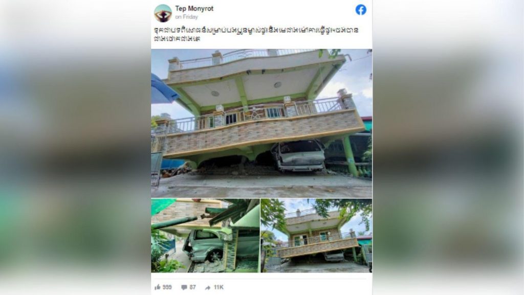 Recently, a viral post containing three photos of a collapsed house implying that it happened in Cambodia was posted on Facebook. This post has been shared many times by social media users and has mixed comments and reactions. However, running a Google Reverse Image search proves that the photo attached with the caption above is misleading.