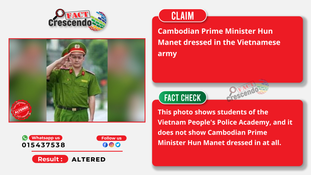 Fact Crescendo Cambodia found that the photos posted and claimed by the above users are not true and were altered before posting. This photo shows students of the Vietnam People’s Police Academy, and it does not show Cambodian Prime Minister Hun Manet dressed in at all.