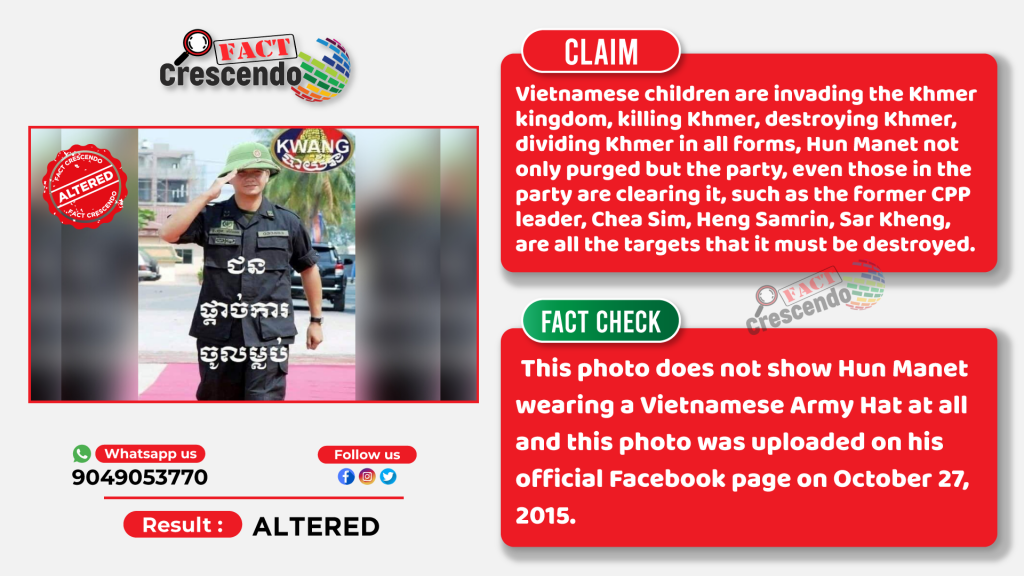 Fact Crescendo Cambodia has found that the photo posted and claimed by the above Facebook user was altered. It had been edited before it was posted on social media. This photo does not show Hun Manet wearing a Vietnamese Army Hat at all and this photo was uploaded on his official Facebook page on October 27, 2015.