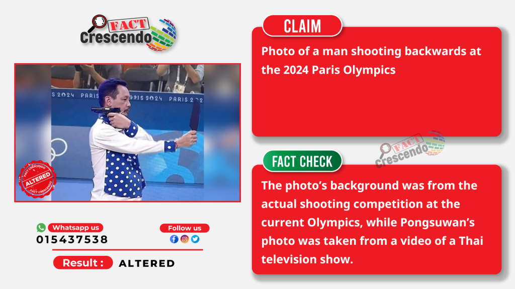 Fact Crescendo found that the above claim posted on social media is false. In fact, the photo’s background was from the actual shooting competition at the current Olympics, while Pongsuwan’s photo was taken from a video of a Thai television show.