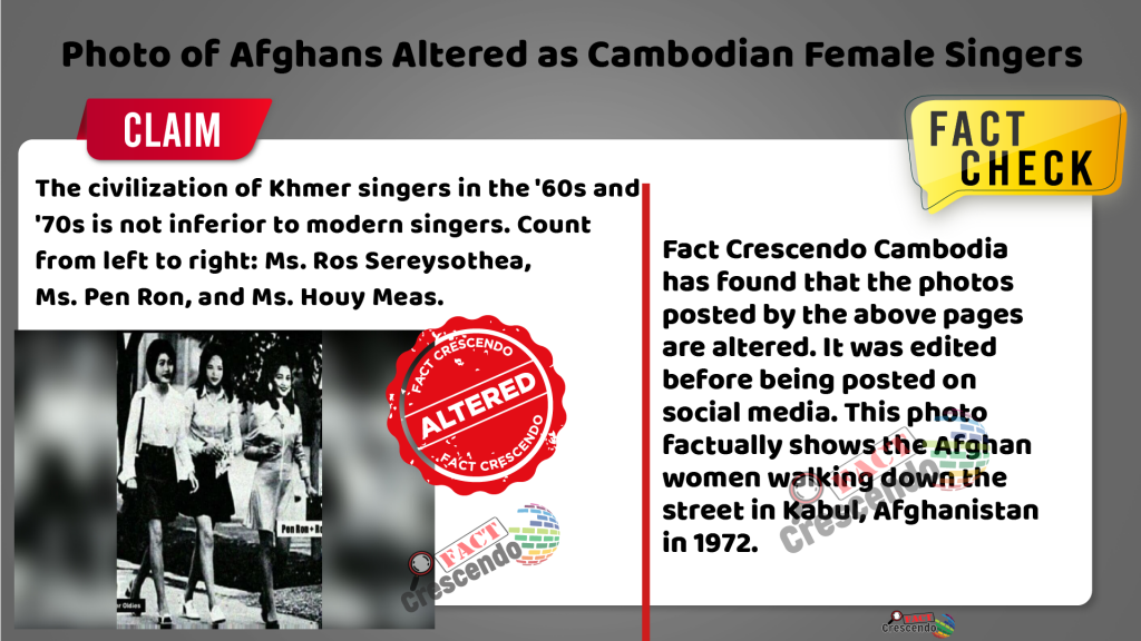 The Golden Voice of the Kingdom of Cambodia in the early generations of Ros Sereysothea, Pen Ron, and Houy Meas were one of the most famous singers in the 60’s until now. Meanwhile, an old photo of three women walking down the street was posted on Facebook. It was claimed that it was a rare photo of the top three pre-1975 Cambodian female singers, Ros Sereysothea, Pen Ron and Huoy Meas walking together to school. This photo was spread by Facebook users and even published on a local online news. However, after running a Google Reverse Image search, it proves that the photo above was actually altered.
