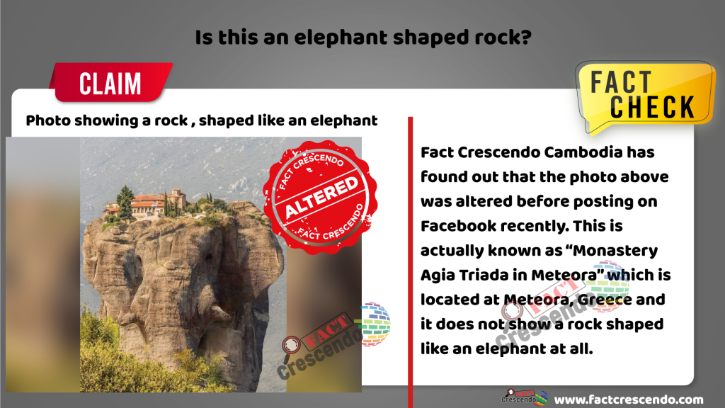 Fact Crescendo Cambodia has found out that the photo above was altered before posting on Facebook recently. This is actually known as “Monastery Agia Triada in Meteora” which is located at Meteora, Greece and it does not show a rock ,shaped like an elephant at all.