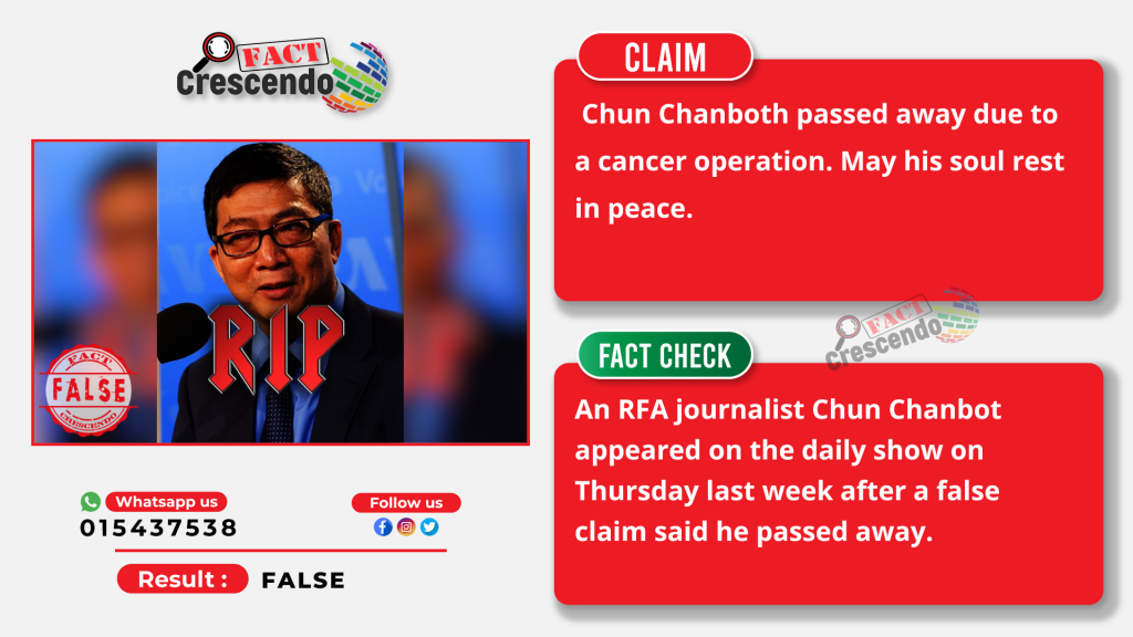 Fact Crescendo Cambodia found out the claim mentioned above was false. The U.S.-based RFA journalist Chun Chanbot is still alive. He appeared in the daily broadcasting on Thursday evening last week after he had been away for a month. Speaking in the show, Chanbot clarified his health is much better and was going back to the daily show on Friday last week.