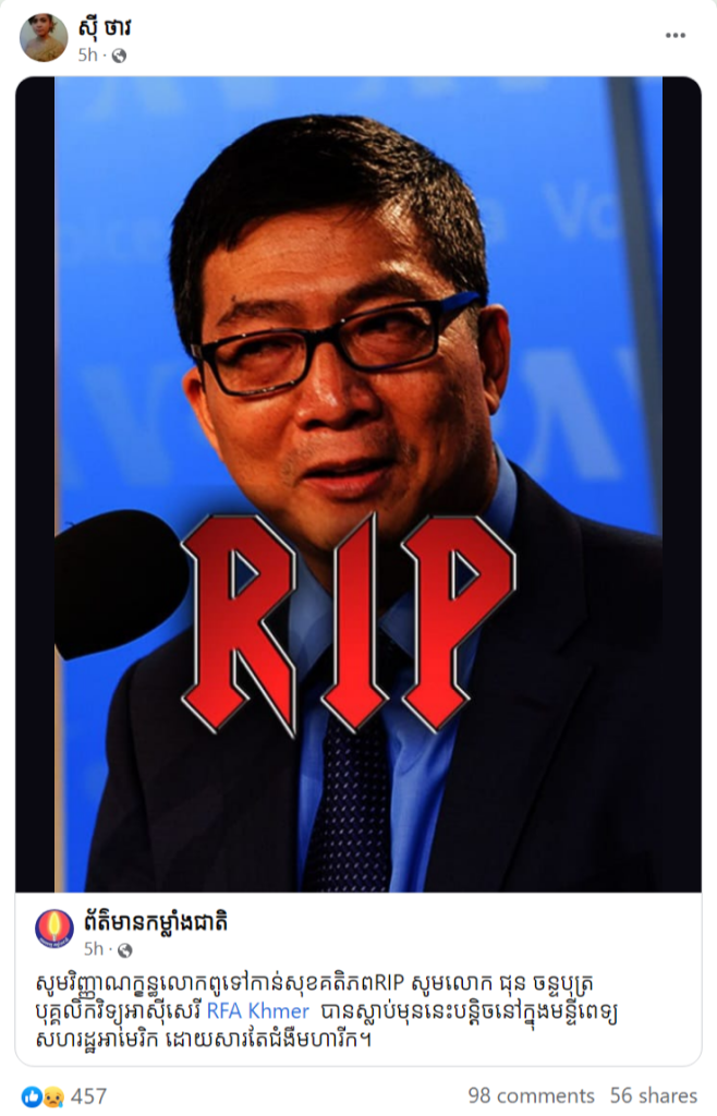As he had been away from his daily show for several weeks, a viral claim circulating on social media last said Chun Chanbot – the U.S.-based journalist working for Radio Free Asia (RFA) – passed away due to cancer. The claim has been widely shared, reacted to, and commented on by Khmer-speaking social media users. However, the journalist’s return to the daily show proves the claim is false.