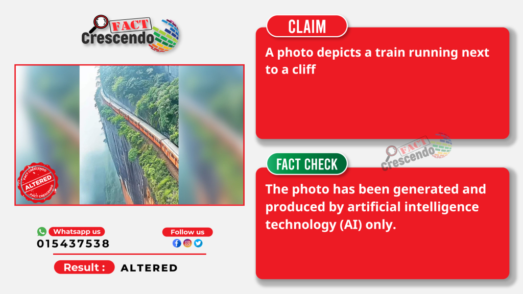 Claims to show a train running next to a cliff were virally shared and reacted to by social media users. However, the Fact Crescendo team found that the narration attached to the video clip was AI-generated.