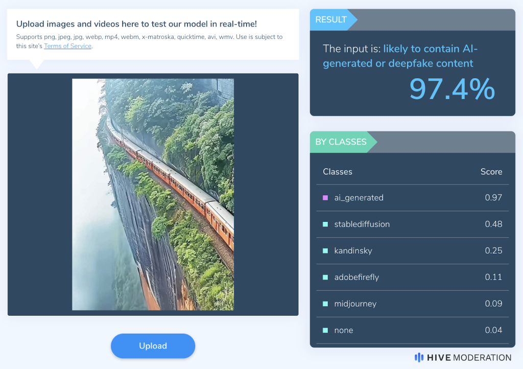 According to Hive Moderation, an automated content moderation software, it uses machine learning models to moderate visual, textual, and audio content in real time, returning tagged metadata. The above photo claimed that the images were indeed AI-generated.