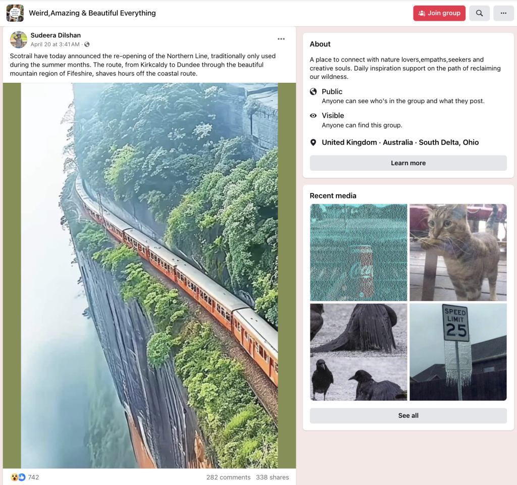 We have found that the source image is from a brief imagery that was uploaded to Instagram by an account that describes itself as “Natural Animation”. This account often shares digitally produced videos and images, some of which show trains and other vehicles close to cliffs.
