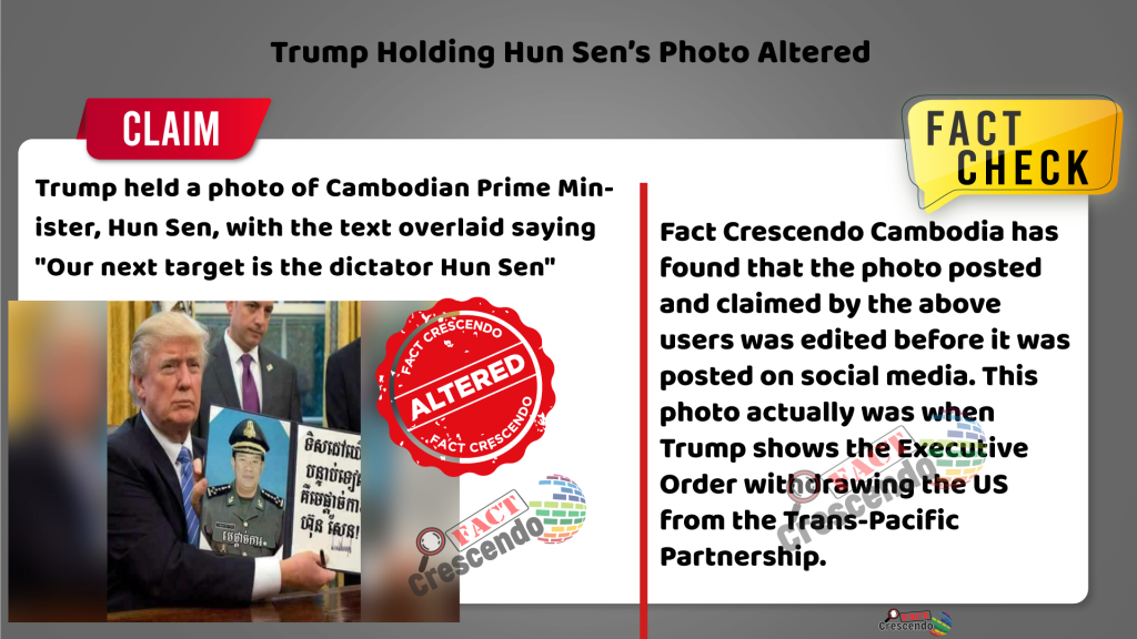 Fact Crescendo Cambodia has found that the photo posted and claimed by the above users was edited before it was posted on social media. This photo actually was when Trump shows the Executive Order withdrawing the US from the Trans-Pacific Partnership.