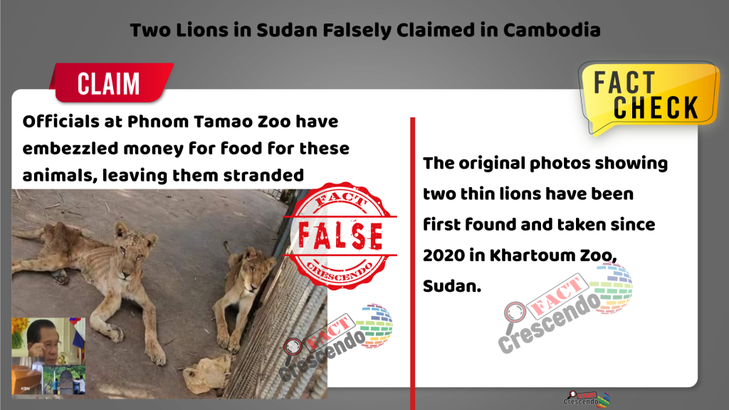 Fact Crescendo Cambodia has found that posting photos with the above-mentioned claims were false. These photos were not the lions at Phnom Tamao Zoo in Cambodia. The original photos showing two thin lions have been first found and taken since 2020 in Khartoum Zoo, Sudan.