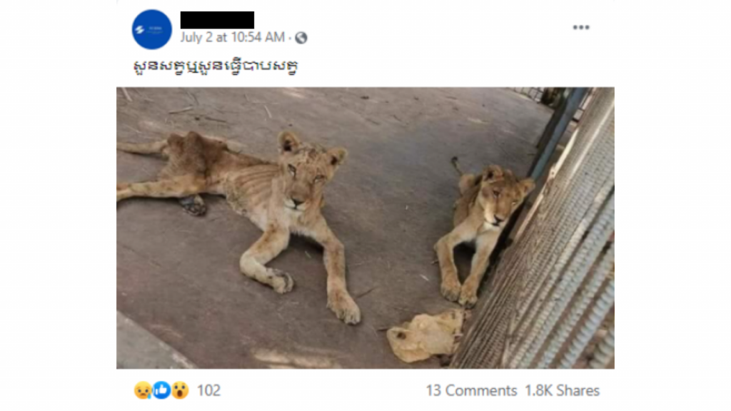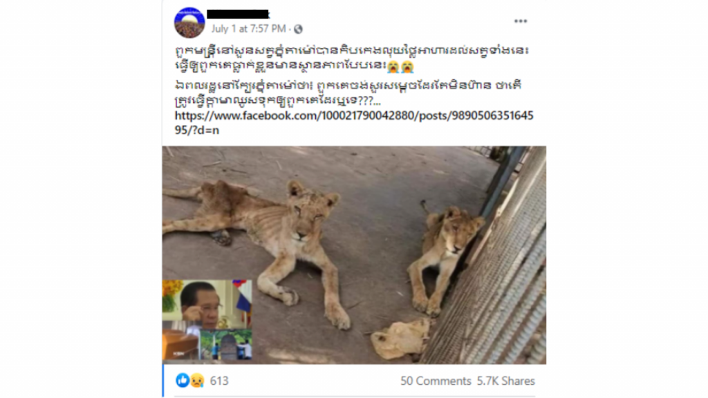On July 1, 2021, one of the Facebook users posted a photo showing the sight of two skinny lions. The same social media user also claims that both lions were kept on the grounds in Phnom Tamao Zoo, a zoo located in Bati district, Takeo Province. Photos with this post have been shared many times, along with mixed reactions and expressions from Khmer-speaking Facebook users after the confiscation of a pet lion from a Chinese national recently.