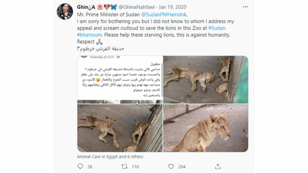 An exact photo with the same format and features of the two lions was found in one of the twitter users posted on January 19, 2020. The same user claimed and asked to Sudanese leader to rescue lions from Khartoum Zoo in Sudan. The following screenshot was captured from the user’s tweet that says in English as​ “Mr. Prime Minister of Sudan @SudanPMHamdok, I am sorry for bothering you but I did not know to whom I address my appeal and scream out loud to save the lions in this Zoo at #Sudan #khartoum Please help these starving lions, this is against humanity”.​