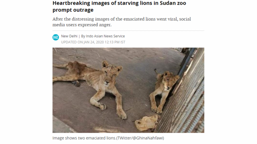 According to the Hindustan Times, it also reported on the sight of a skinny lion on January 24, 2020. The news report further confirmed that these lions are in Khartoum Zoo, Sudan, without specifying that it was located in Phnom Tamao Zoo unlike the users above have claimed at all. The following screenshot was captured from an international news website that states in English as “Heartbreaking images of starving lions in Sudan zoo prompt outrage”.