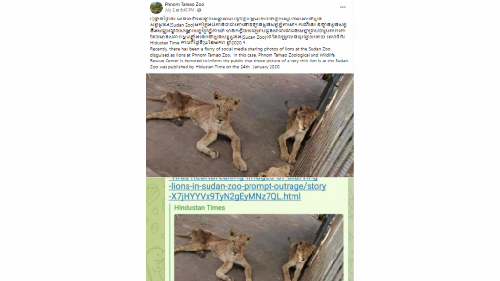 According to the Phnom Tamao Zoo Facebook page, they also denied the allegations on the evening of July 2, 2021, confirming that the photo showing the two skinny lions is actually found in a Sudanese zoo while some misleading users claimed that the animals were in Phnom Tamao Zoo instead. The caption from the Facebook page states in Khmer and translates in English as “Phnom Tamao Zoo and Wildlife Rescue Center honor to inform the public that this very thin lion image was factually taken from the Sudan Zoo and it was also published by Hindustan Time on January 24, 2020”.