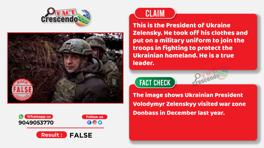 Fact Crescendo Cambodia found the claim mentioned above is false. This image depicts Ukraine’s President Volodymyr Zelenskyy wearing military uniform visited his country’s troop positioned in war zone Donbass region in last December. The image is totally unrelated to claim above.