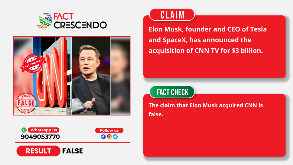 Fact Crescendo has determined that the viral claim mentioned above is false. Our investigation revealed that there has been no official announcement from CNN’s parent company, Warner Bros. Discovery, or Elon Musk regarding a bid for the television network. This conclusion is supported by the absence of any credible reports or statements from either party involved.