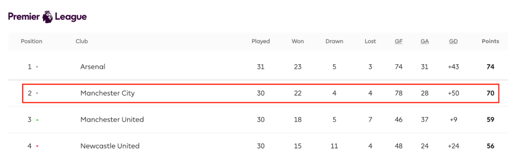 The official English Premier League website shown as of April 20, 2023, confirmed that Manchester City is standing behind Arsenal with 70 points.