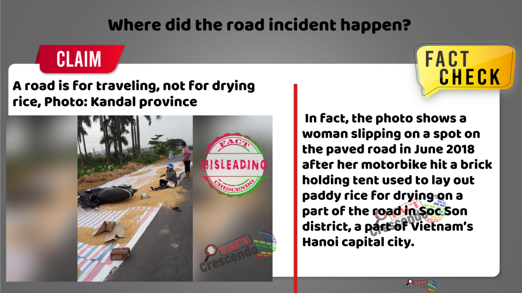 Fact Crescendo Cambodia found out the claim as mentioned above is misleading. The road incident in the photo did not happen in Cambodia’s Kandal province. In fact, the photo shows a woman slipping on a spot on the paved road in June 2018 after her motorbike hit a brick holding tent used to lay out paddy rice for drying on a part of the road in Soc Son district, a part of Vietnam’s Hanoi capital city.