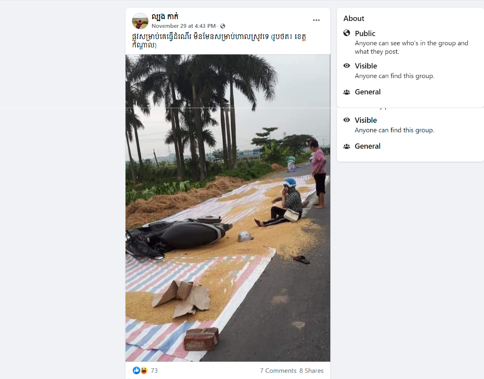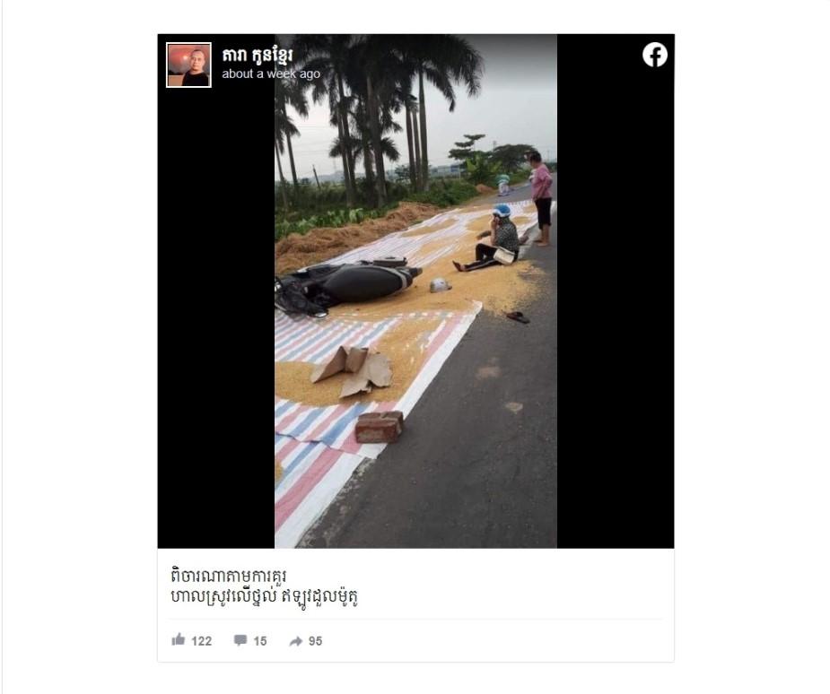 On November 29, a Facebook user posted a photo in a group of social media. The photo shows a woman slipped on a sport of paved road where rice was dried on. The Facebook user claimed the road incident took place in Kandal province, Cambodia.
