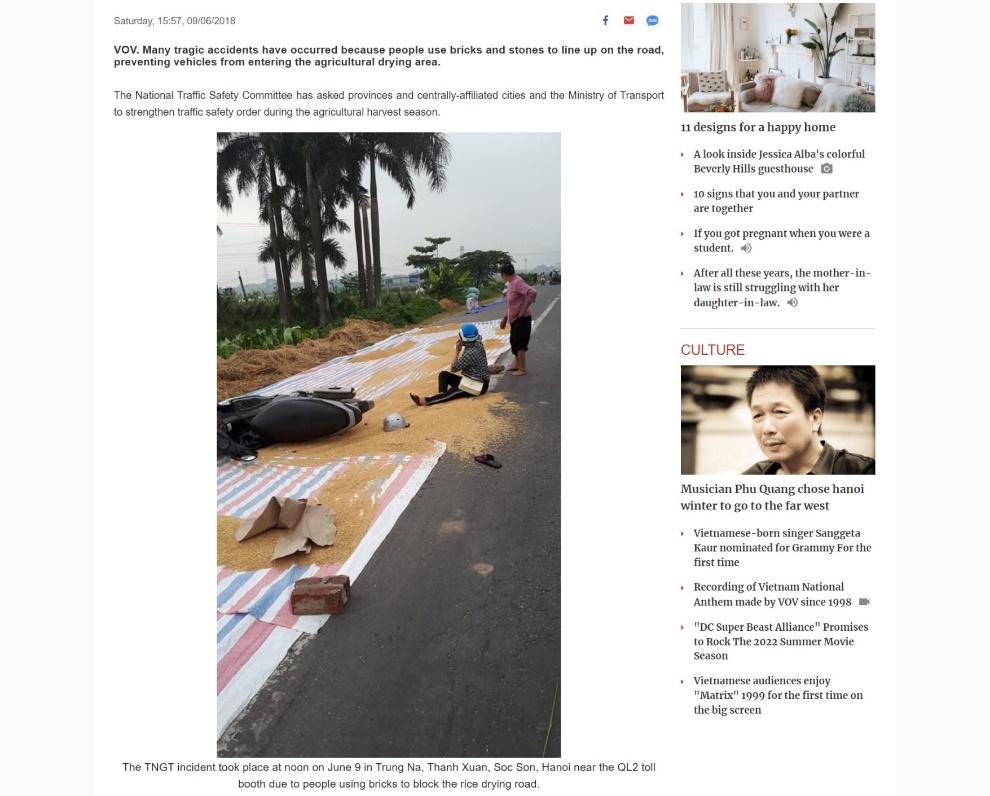 Below is the capture of the VOV’s photo with a caption saying the drying paddy rice on a spot of paved road leads to the road incident.