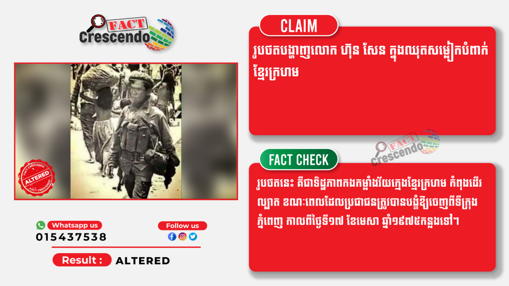 Fact Crescendo Cambodia រកឃើញថារូបថត និងការលើកឡើងដោយអ្នកប្រើប្រាស់ហ្វេសប៊ុកខាងលើនោះ គឺពិតជាមិនត្រឹមត្រូវនោះឡើយ។ ច្បាប់ដើមនៃរូបថតនេះ គឺជាទិដ្ឋភាពកងកម្លាំងវ័យក្មេងខ្មែរក្រហម កំពុងដើរល្បាត ខណៈពេលដែលប្រជាជនត្រូវបានបង្ខំឱ្យចេញពីទីក្រុងភ្នំពេញ កាលពីថ្ងៃទី១៧ ខែមេសា ឆ្នាំ១៩៧៥កន្លងទៅ។